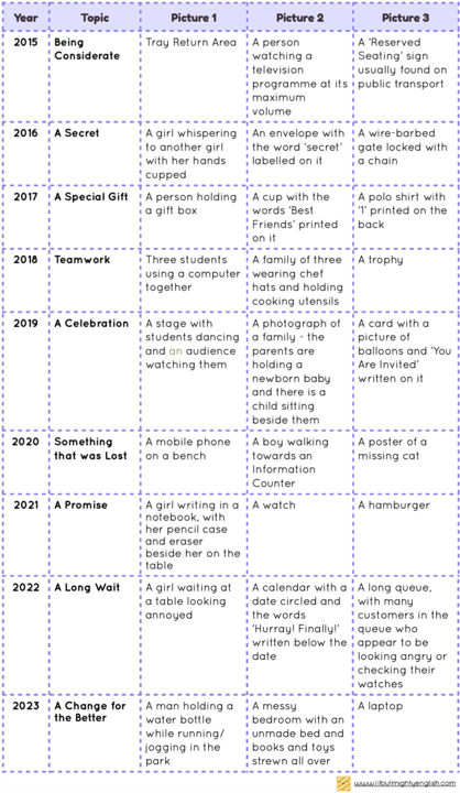 Below is a compiled list of PSLE Continuous Writing Topics from 2015 to 2023. In this compiled list, you will find the different topics – and a brief description for each of the accompanying pictures – tested each year starting from 2015, which is the year the new format for composition came out.