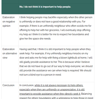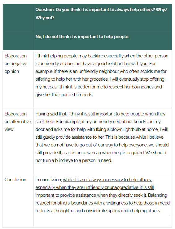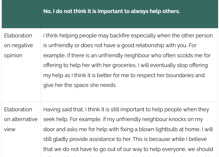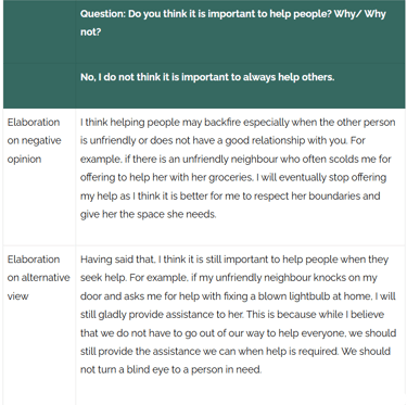 Other than providing logical reasons and relevant personal experiences to substantiate the negative response, it is also possible to discuss both sides when elaborating. When introducing an alternative view or presenting a different perspective, do use words/phrases like ‘However’ , ‘On the other hand’ , ‘Having said that’ to clearly indicate the shift.