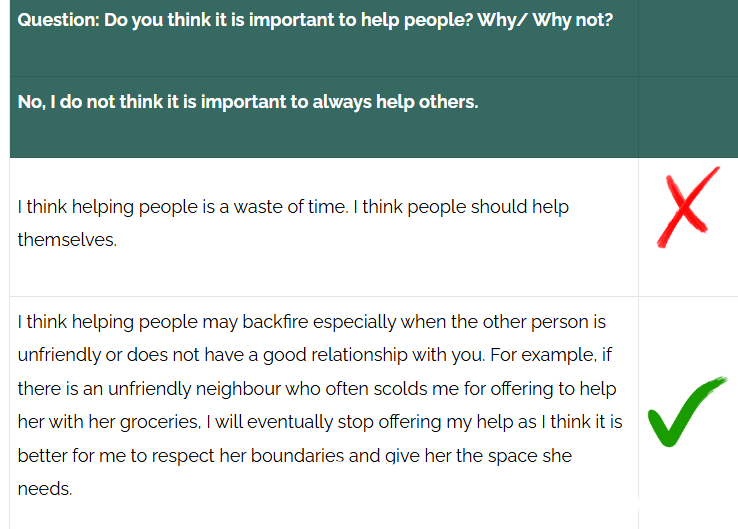 Remember that there is no single correct answer when it comes to the oral examination. Rather than looking out for a perfect response, examiners are looking at how students are able to express their personal opinions, ideas and experiences clearly and effectively. Every student is entitled to his or her own opinion and it is perfectly fine! It all boils down to how the student elaborates to support his or her opinion.