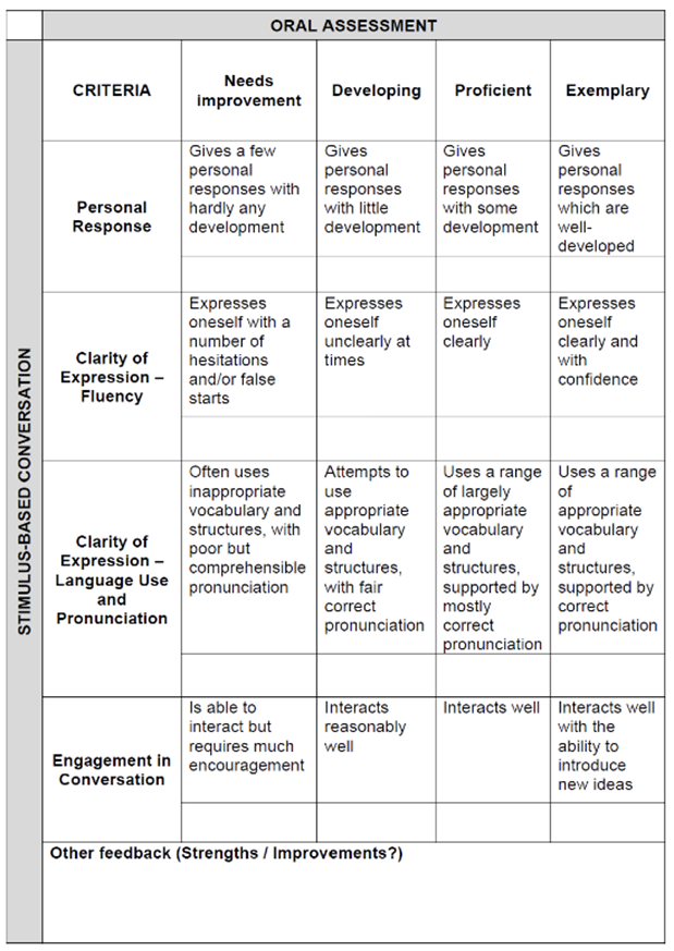 The grading is based on how effectively students express their personal response to the stimulus, maintain a conversation with the examiner, and use language correctly and appropriately.